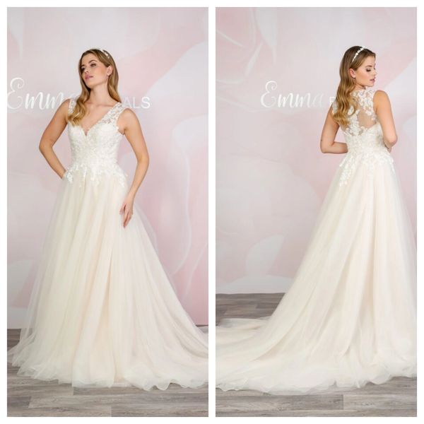 Feel like a princess in this gorgeous Emma bridal gown. Layers of gathered tulle create the softest flowing skirt while sparkle lace embellished with shimmering pearls, adorns the bodice. With a V-neck front and high illusion back, this style is both super comfortable and flattering.