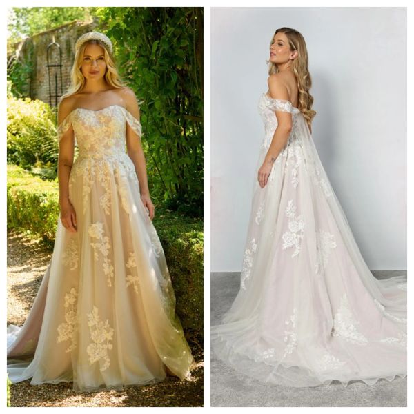 A stunning and unique bridal gown. This romantic wedding dress has a tulle and lace bodice that flows into a full A-line organza, tulle and lace skirt. The lace from the bodice is scattered over the full skirt to create a beautiful flow to the dress. It has bardot draped off-the-shoulder straps in pretty floral lace. These flow around to the back of the dress into two delicate wings that complement the stunning bridal train to complete the dress.