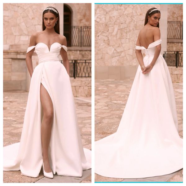 A beautiful matte satin Princess bridal gown with a sweetheart neckline and a figure flattering draped bodice, fitted to the natural waist. This stunning gown also features off shoulder draped sleeves and is finished with a daring split skirt and pockets.