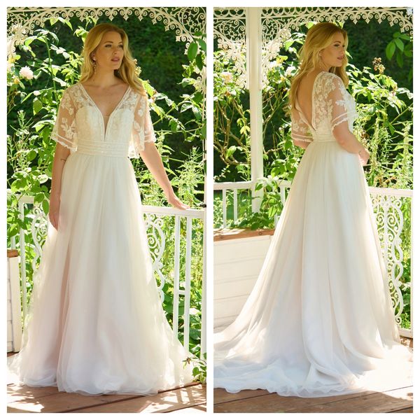 A beautiful wedding dress with statement V-neckline. The bodice is made in our tulle, with boho appliques and lace trim, showing just the right amount of skin beneath. The waterfall short sleeves add light coverage to the tops of your arms and create a pretty design detail. The wide waistband really showcases your shape and gently flows into the organza and tulle skirt, finished with pretty train.